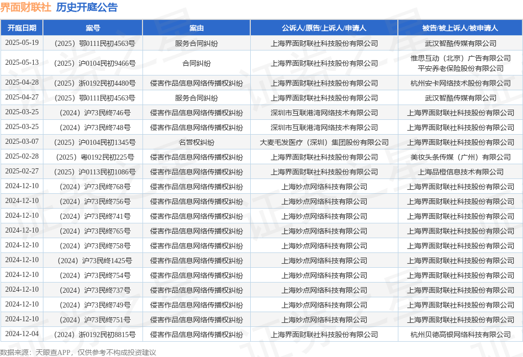 案号:(2025)沪0104民初9466号审理法院:上海市徐汇区人民法院案由:合同纠纷当事人信息: 原告/上诉人:上海界面财联社科技股份有限公司 被告/被上诉人:惟思互动(北京)广告有限公司、平安养老保险股份有限公司开庭日期:2025年5月13日根据统计,近一年内以上海界面财联社科技股份有限公司为当事人的历史开庭公告有44则,其中案由为“侵害作品信息网络传播权纠纷”的公告以37则居首,其次为“名誉权纠纷”有2则,“服务合同纠纷”有2则。历史开庭公告(前20条)如下: